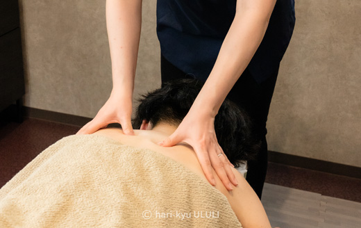 「はり」という名前から、痛い治療と思われる事も多いのですが、髪の毛ほど細く、とても柔らかい素材の鍼を使用するため、痛みはほとんどありません。痛みの原因となる筋肉や神経にアプローチしたり、ツボを使って内蔵や全身の気の流れを整える等、様々な角度からアプローチしていきます。